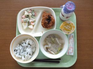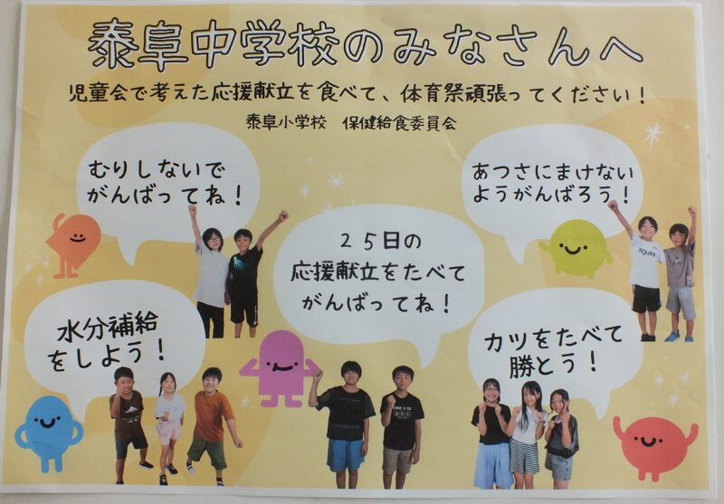 小学生のみなさんが中学生のみなさんのために給食の献立を考えてくれました。文化祭の体育祭で頑張れるようにと給食を通して文化祭の成功を願ってくれているんだと思うと、こんなに嬉しいことはありません。また、中学生の考えた献立が小学校の給食にもなるということも聞いています。心温まる給食の一時となりました。