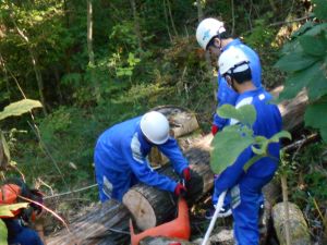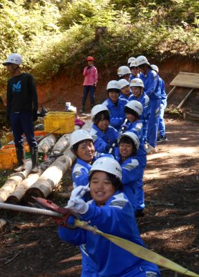 森の学習を通して、木を切り出して運ぶ苦労があって、木材製品が自分たちのもとに届くということを本日の活動で実感できました。みんなで引き上げた木が谷から上げられると自然と子どもたちの表情に笑みが浮かびました。木を切り出していく際、吸い付くようにその様子を見ている姿や、大きな声で「せーの」と一生懸命言ってくれる姿、こうした方が良いんじゃないですか?と提案している姿、教室から離れ、自然の中で学び取っている生徒の姿が印象的でした!!