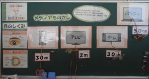 10月10日は過ぎてしまいましたが、保健室前に目の愛護デーに関わる興味深い掲示物があります。眼鏡をかけて見てみるとパソコン、ゲームをする時の適正な距離は納得と思ったんですが、テレビは意外と適正距離が長く驚きでした。体験を通して学べるように養護の先生が作成し、掲示ししてくださっています。是非保健室前で体験してみてください。