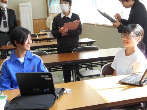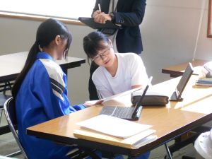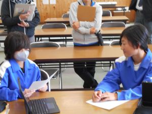 小学6年生が「What a great school!」と思ってくれるような泰阜中の魅力を伝えよう!と単元を貫く学習問題から本日は、泰阜中の魅力が相手により伝わるように内容や構成を考えようという学習活動でした。それぞれ自分の願い、思いを出発点にしてペアで交流しながら自分の表現を吟味している姿がありました。仲間の良い表現をかりながら、さらに自分の表現を良くしていく生徒、自分の表現が本当に相手に伝わるのかをこだわっている生徒、先生が黒板に示してくれた視点を見比べながら書き直している生徒、その生徒だからこその学び方が良いなと感じました。