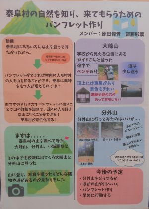 泰阜中学校 探究学習発表会が12月2日(火)14:00~15:20 場所は泰阜中学校体育館で行います。今年度泰阜中では、「泰阜村のために!」をテーマに生徒の「こうしたい」「ああしたい」を出発点に「食品」・「自然」・「SDGs」・「ものづくり」・「観光」講座をつくり、探究学習を行ってきました。村へ飛び出し、村の人達と出会い、探究を続ける子どもたちはどんどん成長していっています。今年度のまとめとなる探究発表を、是非ご覧ください。