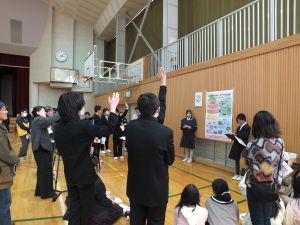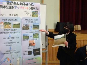 1月29日(木)に探究学習発表会を行いました。12月2日(火)に行われる予定でしたがインフルエンザの関係で延期となっていました。文化祭の時の発表と比べると、注目してほしいところに手をかざして説明したり、クイズ形式にして聴衆を巻き込んだりして工夫がされていました。1回目発表した後の2回目は自分で声の大きさを調整している姿もありました。確かな進化が見られました。生徒の1年間の振り返りでは、「泰阜村のために活動できて嬉しかった」「仲間って大事」「みんなでやればできると実感でき楽しかった」「難しかった!」「大変だったけどやり切れて楽しかった」やってきたからこそ感じること、わかることが溢れていました。