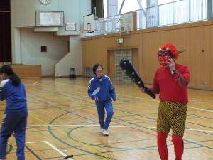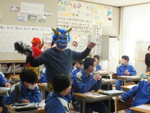 2月3日(火)は節分です。泰阜村役場から教育長さんが鬼の格好をして小中学校に来てくれました。12月のサンタクロースも小学校でやっていただいたということで今回は中学校にも。授業の中での登場で、生徒は驚きながら豆を投げていました。こうやってその状況に乗れることも泰阜中生の良いところ!日本の年中行事を少しでも大事にしてもらえればという思いを感じることができました。